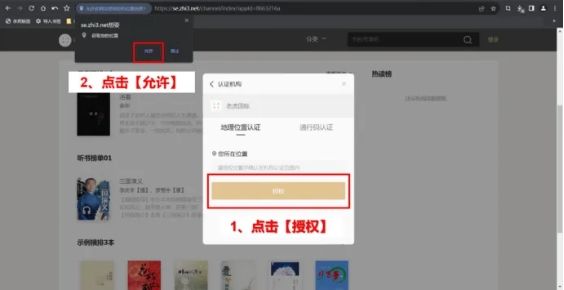 地理位置认证:点击【授权】,点击【允许】使用你当前的位置,即可开启免费在线阅读。