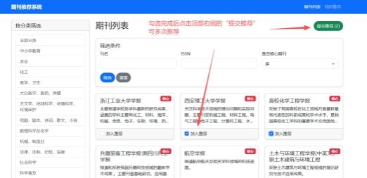2、查询到所需期刊,勾选“加入推荐”后,点击顶部右侧“提交推荐”即可(如图)。可多次推荐。